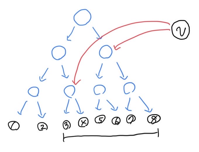 예를 들어, 정점 $v$에서 정점 $3$부터 정점 $8$까지 연속한 6개의 정점에 나가는 간선을 연결한다고 하자. Naive하게 간선을 추가하면 6개의 간선을 추가하는데, 다음과 같이 세그먼트 트리를 구성할 때와 비슷하게 가상 정점과 가상 간선들(그림에서 파란색)을 만들어 준 후, 그 가상 정점을 향하는 2개의 간선(그림에서 빨간색)만 추가하면 6개 정점에 모두 나가는 간선을 만드는 것과 같은 상황이 된다. 즉, 크기가 $r$인 연속한 범위의 정점에 간선을 연결하는 상황이 간선을 $r$ 개 추가하는 것이 아닌, 최대 $2 \lg r$ 개 간선만 추가해도 된다. 세로 선분에서 닿는 물폭탄의 번호는 물폭탄들이 $x$, $y$ 좌표 순으로 정렬되어 있을 때 연속하기 때문에 마찬가지의 방법으로 간선을 만들 수 있다.