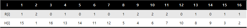 위는 설명을 위한 다른 예시다. $K = 3$이며, $R[i]$에 적힌 값들은 처음 들어온 배열 $R$의 값이고, $H[i]$에 적힌 값들은 앞에 설명한 방법으로 구한 배열 $H$의 값이다.