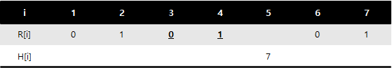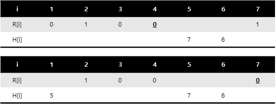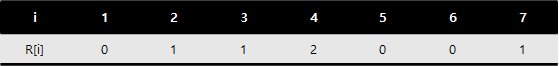예시에서 두 조건을 만족하는 $i$는 5로 유일하다. 예를 들어, 6의 경우 $R[6] = 0$으로 1)번 조건을 만족하지만, $R[5] = 0$이기 때문에 2)번 조건을 만족하지 못한다.