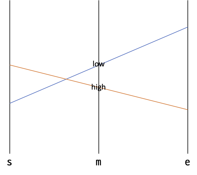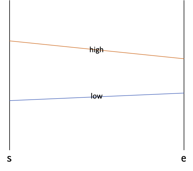Li Chao tree의 구간 [s, e]를 대표하는 어떤 정점에 직선 $y = ax + b$를 갱신하는 상황을 보자. $x = s$일 때 직선의 y 좌표의 값이 낮은 직선을 low, 큰 직선을 high라고 보면 다음과 같이 3가지 상황이 있을 수 있다.