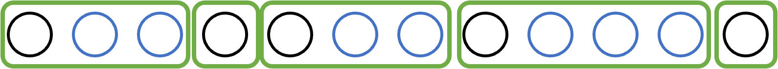 자, 그러면 마지막으로 남은 것은 이것을 구현하는 방법에 대한 것이다. 이 알고리즘은 증명도 까다롭고, 구현도 간단하지 않다. 다음 그림은 Hu-Tucker algorithm의 중간과정을 그림으로 표현한 것이다. 기존 수는 검은 동그라미, 기존 수가 아닌 것은 파란 동그라미로 그려졌다. 초록색 덩어리들을 하나로 묶어서 Skew heap(두 힙을 하나로 합치는데 $O(\lg n)$ 시간이 걸리는 힙)으로 구현이 비교적 간단하다.