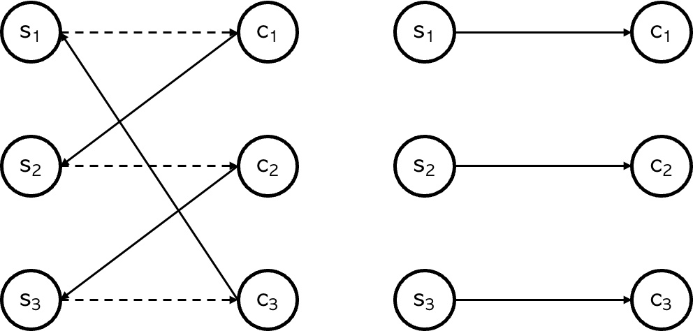 우선 임의의 완전매칭을 구한다. 현재 상황에서, 남은 사탕 중에 어떤 학생 $i$와 제일 가까운 사탕이 $j$이고 완전 매칭에서 $i$와 $j$가 매칭 되어있다면, 학생 $i$가 호명되어 사탕 $j$를 가져가면 된다. 이제 이러한 학생이 한 명도 없을 때 완전 매칭을 적절히 바꾸어 이런 학생이 생기도록 항상 만들 수 있음을 보이겠다. 어떤 학생 $s_1$과 가장 가까운 사탕은 $c_1$이고, 완전 매칭에서 $c_1$은 $s_2$와 매칭 되어 있다. 마찬가지로 $s_2$와 가장 가까운 사탕은 $c_2$고, 완전 매칭에서 $c_2$은 $s_3$과 매칭 되어 있다. $s_3$와 가장 가까운 사탕은 $c_3$이고, 완전 매칭에서 $c_3$은 $s_1$과 매칭 되어 있다. 이러한 사이클을 우리는 항상 찾을 수 있고, 이러한 사이클을 찾은 경우, $s_1$을 $c_1$과, $s_2$는 $c_2$와, $s_3$은 $c_3$과 재매칭 시킬 수 있다. 아래 <그림 2>를 참고하자. 즉, 임의의 사이클을 찾은 뒤 이러한 재매칭 작업을 통해 어떤 학생 $i$와 가장 가까운 사탕 $j$를 매칭 시킬 수 있다. 이 과정을 반복하여 문제에서 요구하는 답을 항상 구할 수 있다. 동시에 위에서 말한 필요조건이 필요충분조건임을 증명했다.