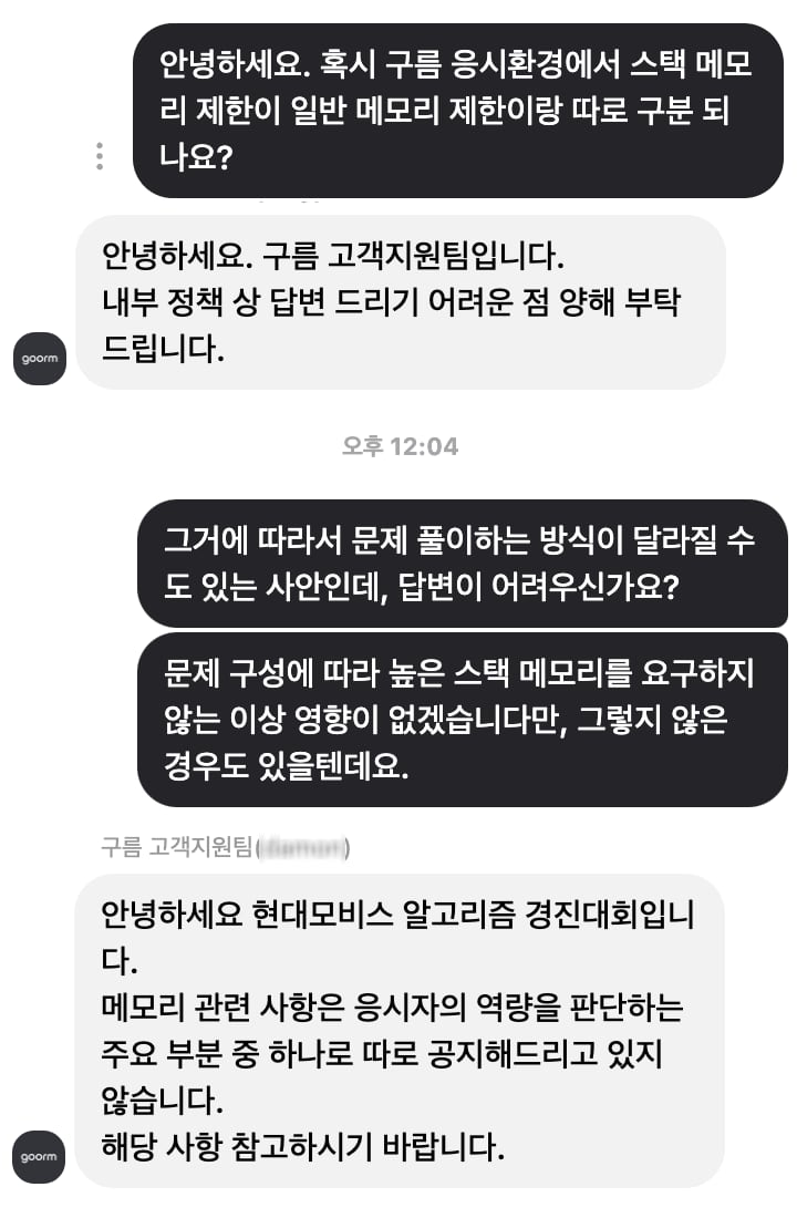 문제마다 시간 제한은 적혀있지만, 메모리 제한은 적혀있지 않았다. 그리고 스택 메모리 제한이 따로 있는지에 대해서도 언급이 없었다. 예선 대회 며칠 전 응시 환경 테스트로 나눠준 링크에 들어가서 테스트했을 때는, 스택 메모리 제한이 1MB 정도로 세팅되어 있는 것처럼 보였다. int argument 1개 있는 재귀 함수 깊이 10만은 잘 돌아가고 깊이 30만은 Segmantation fault 뜨는 정도였다. 이에 대해 공지가 없어서 1:1 문의하기로 질문한 결과 황당한 답변이 돌아왔다.